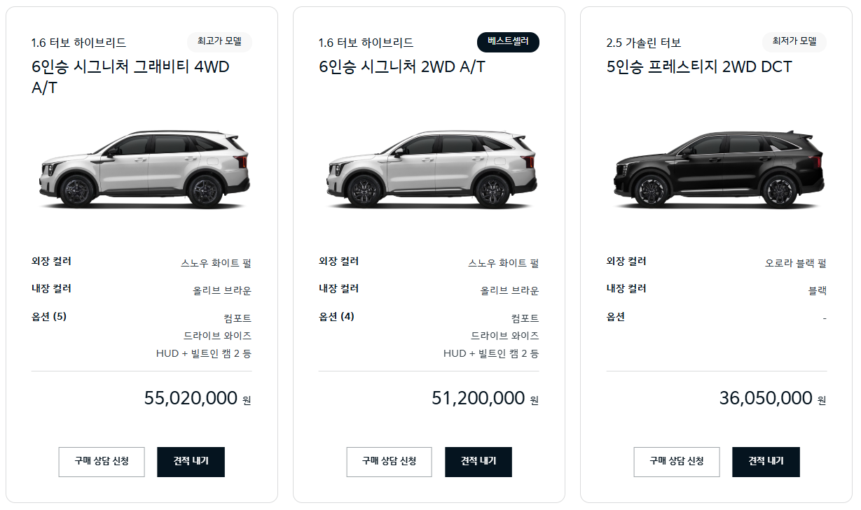 2025 쏘렌토 하이브리드 가격 및 트림별 비교